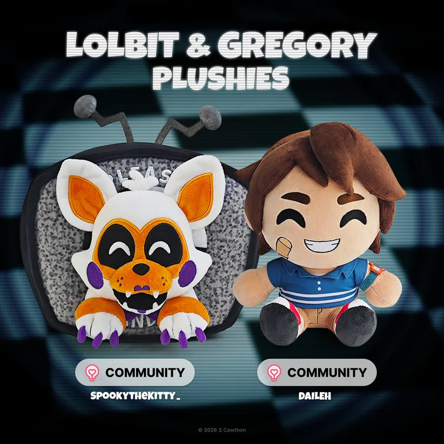Two community plushies of Lolbit and Gregory (by SpookytheKitty_ and Daileh respectively)