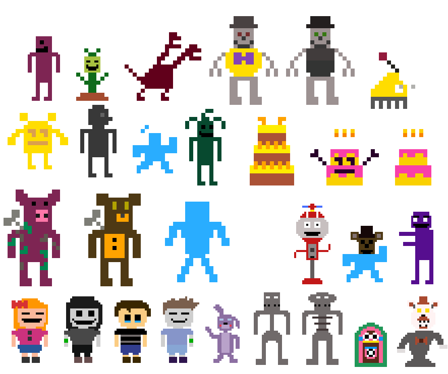 I know jackshit about pixel art so I started by making some fnaf sprites with varying degrees of success. Ignore the inconsistent artstyle pretty please.