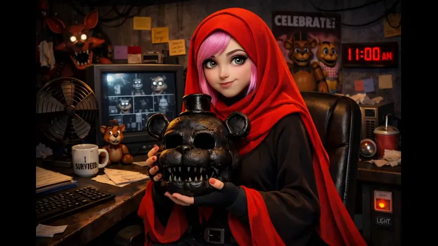 Loading...Girl holding a statue of Freddy In Office!