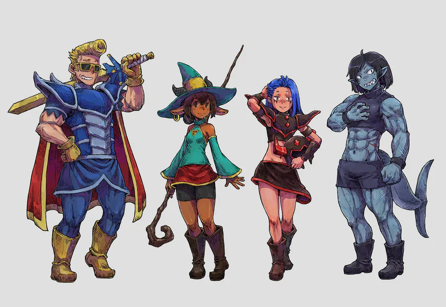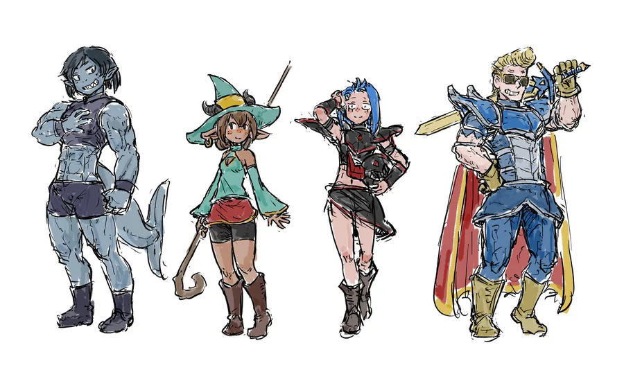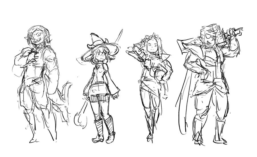 Character portraits for the members of the Adventurers' Guild! I also added some of the initial sketches :)