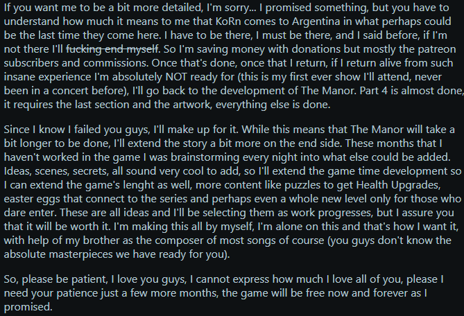 The game will be done and released, but in a few months. Priorities changed, May 10 is coming, I'm saving as much money as I can so I can be there, once that's done I'm back into full dev. I promise. ILY.