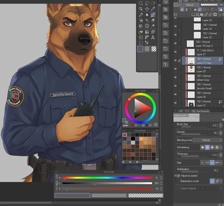 Even though this character is just a security guard, I still paid attention to the details. I started drawing around 2 a.m. one day and finished exactly at 2 a.m. the next day—haha.