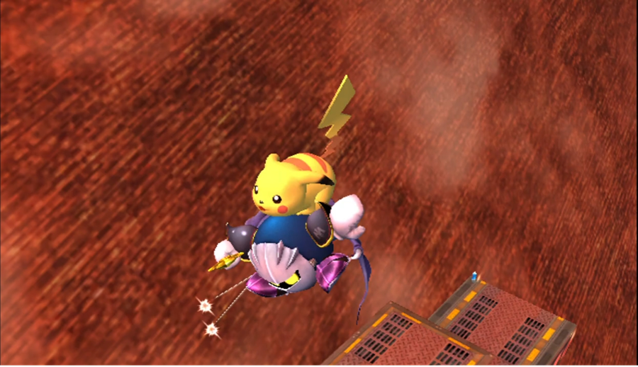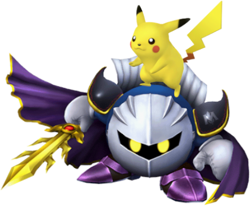 Pikachu rides on Meta Knight's back