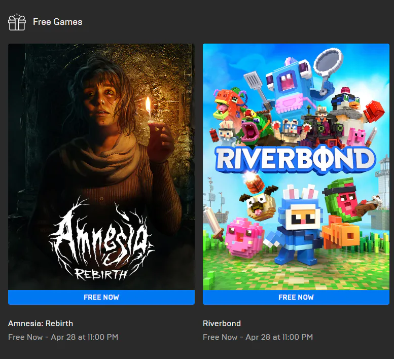 Amnesia Rebirth and Riverbond on EpicGames.