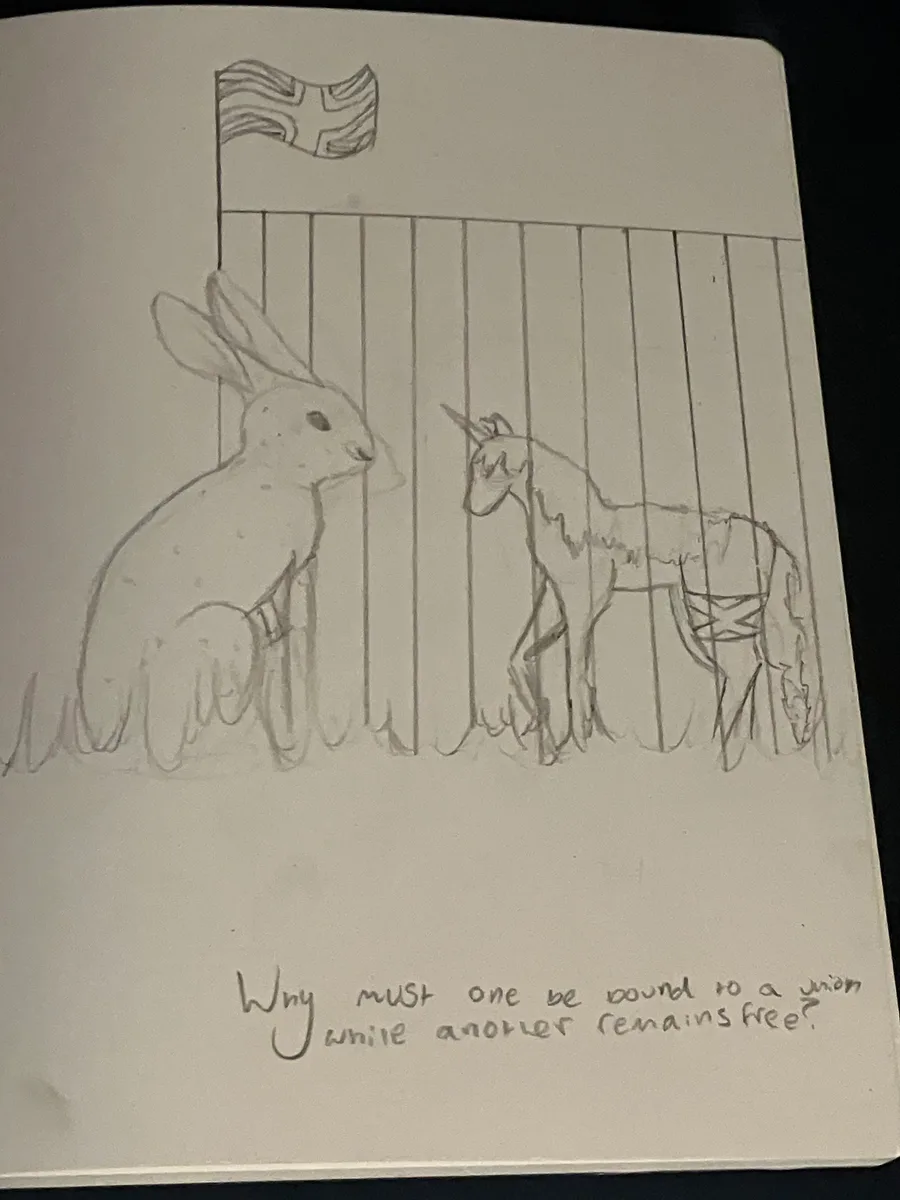 So… this one’s about Scottish and Irish independence. The hare (foreground) represents Ireland and the unicorn (background), Scotland. The cage represents the U.K.