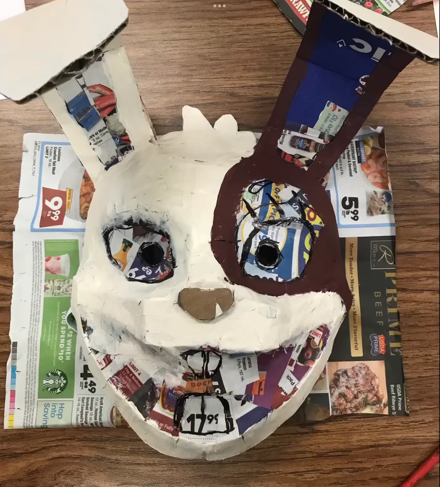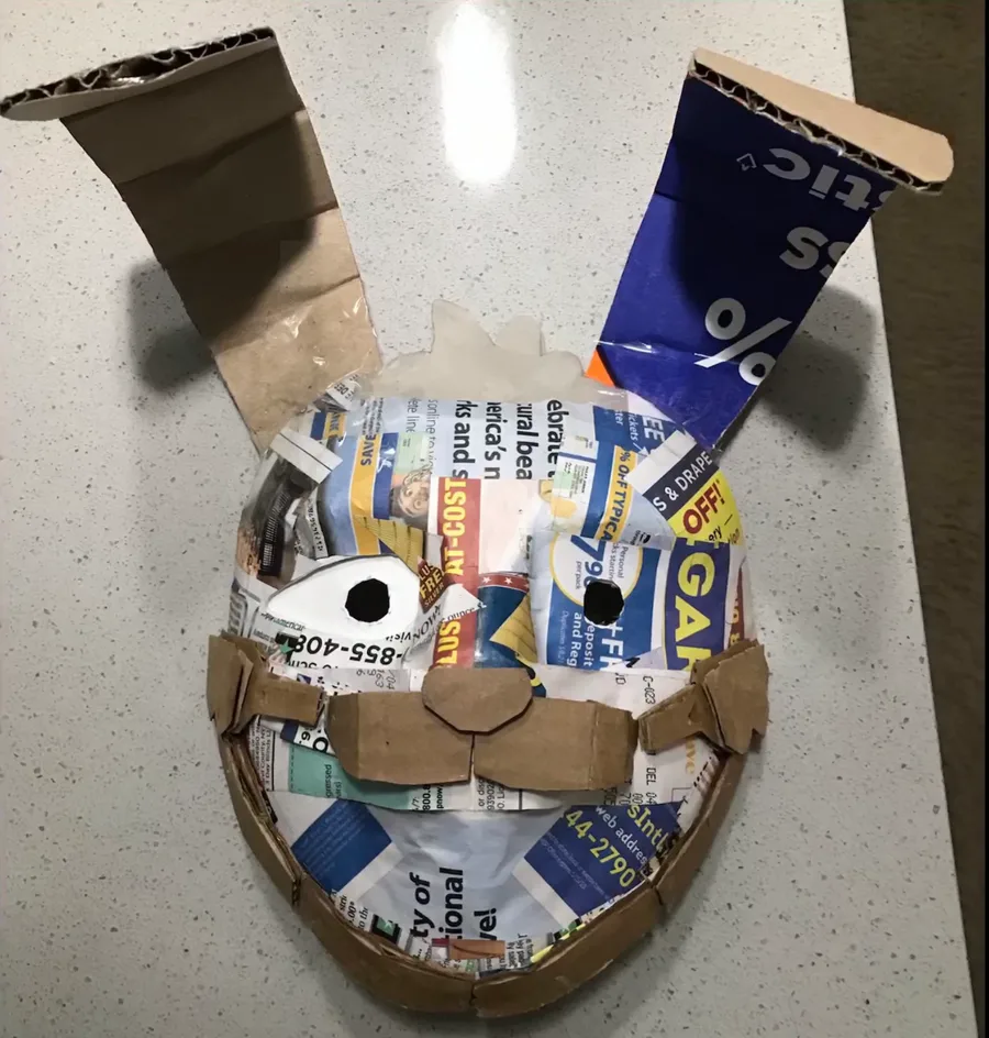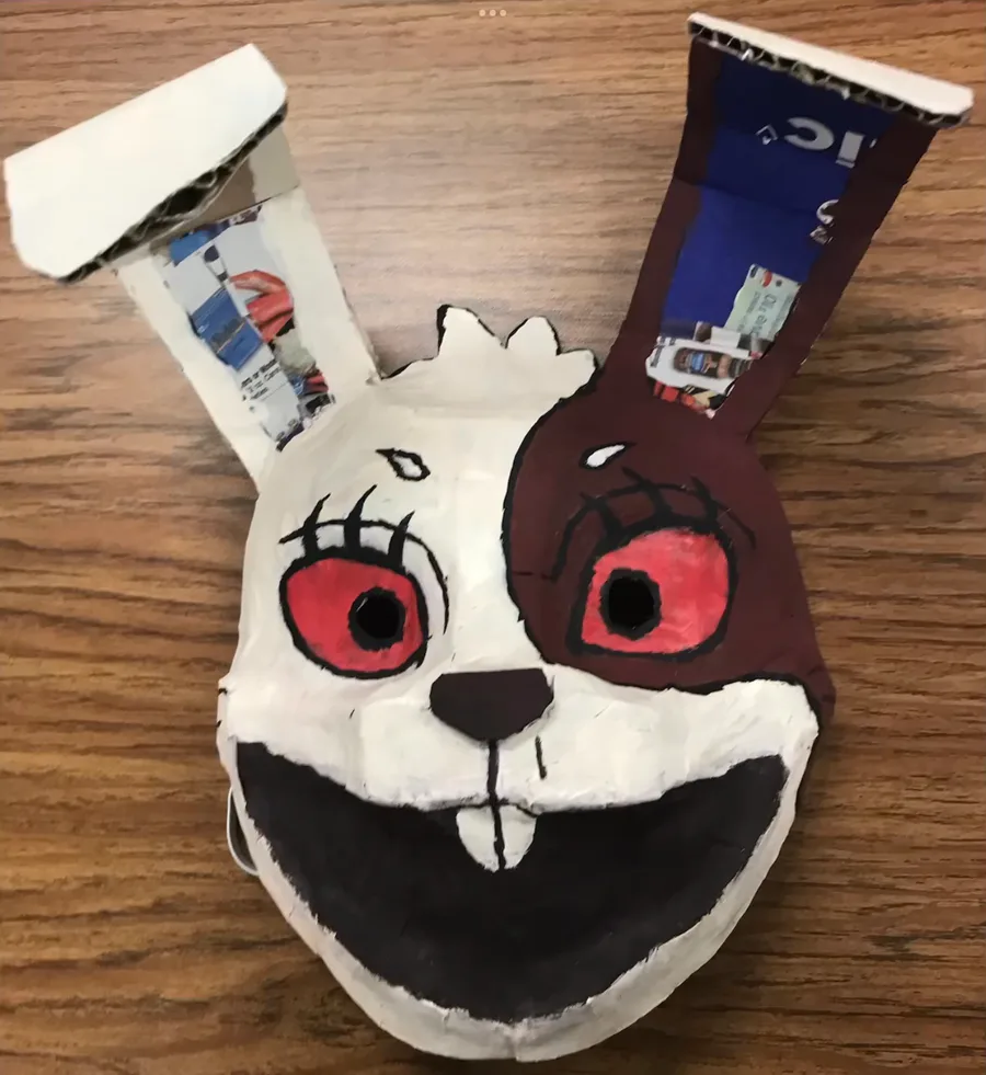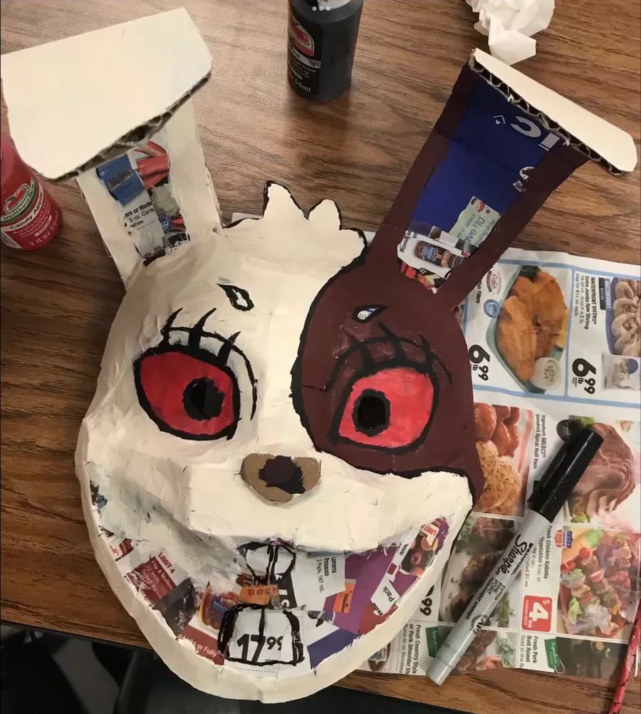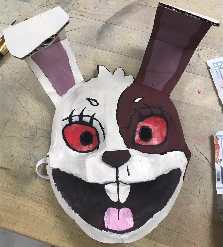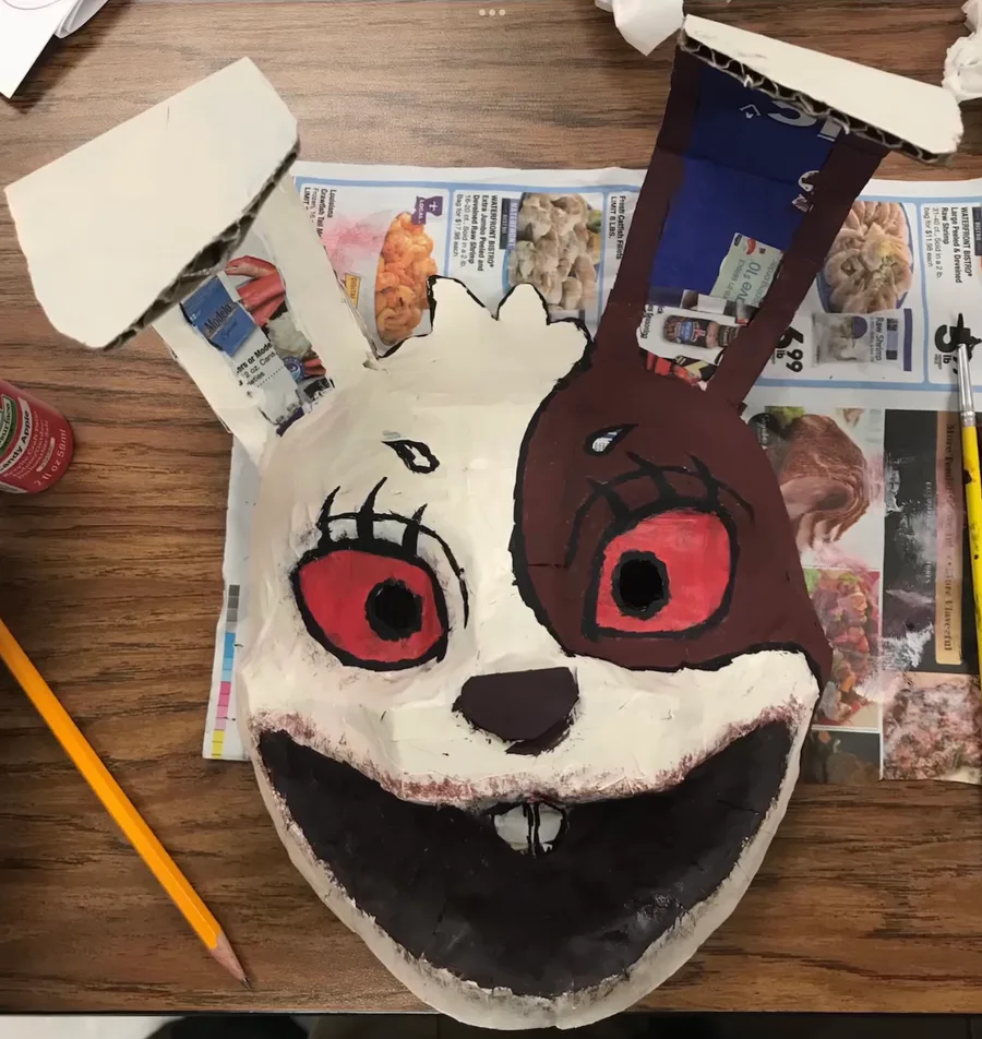 Mi máscara de Vanny para mi proyecto de arte echa de cartón pegamento y periódico