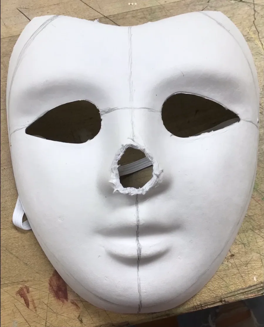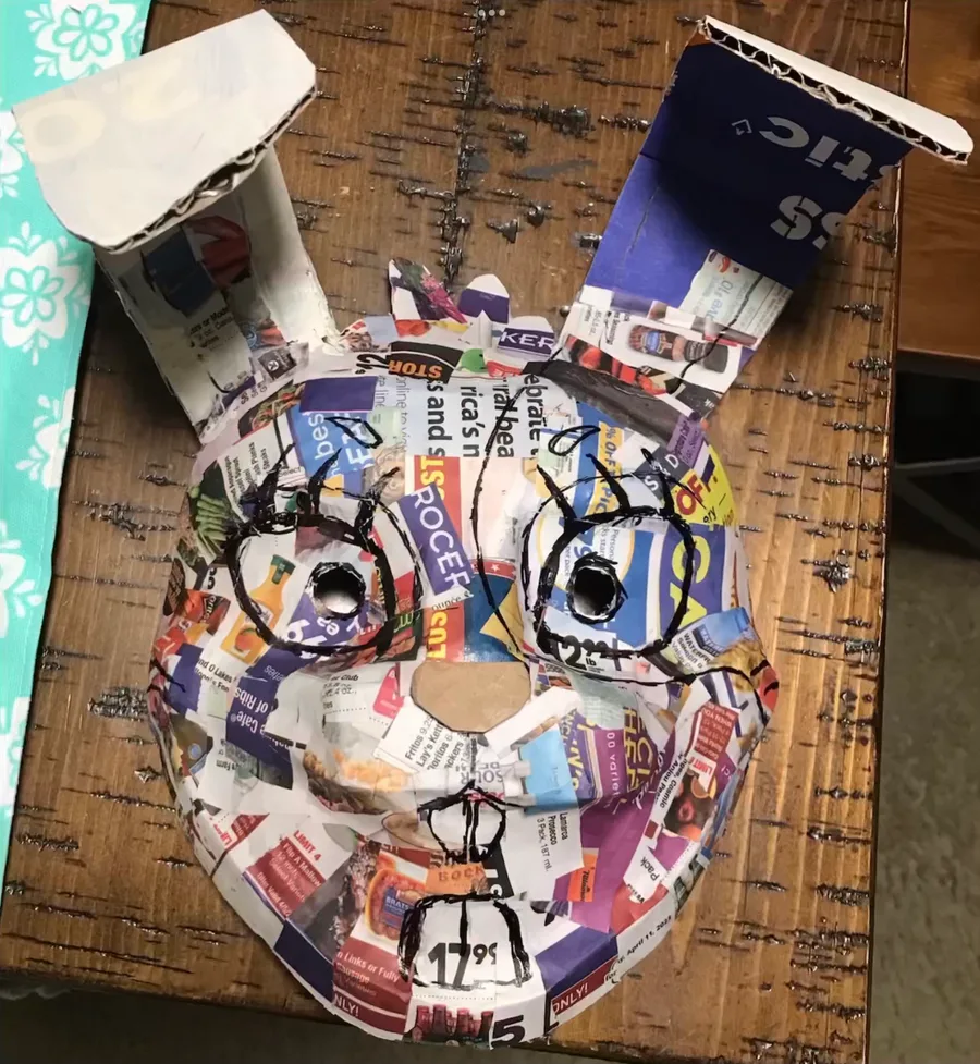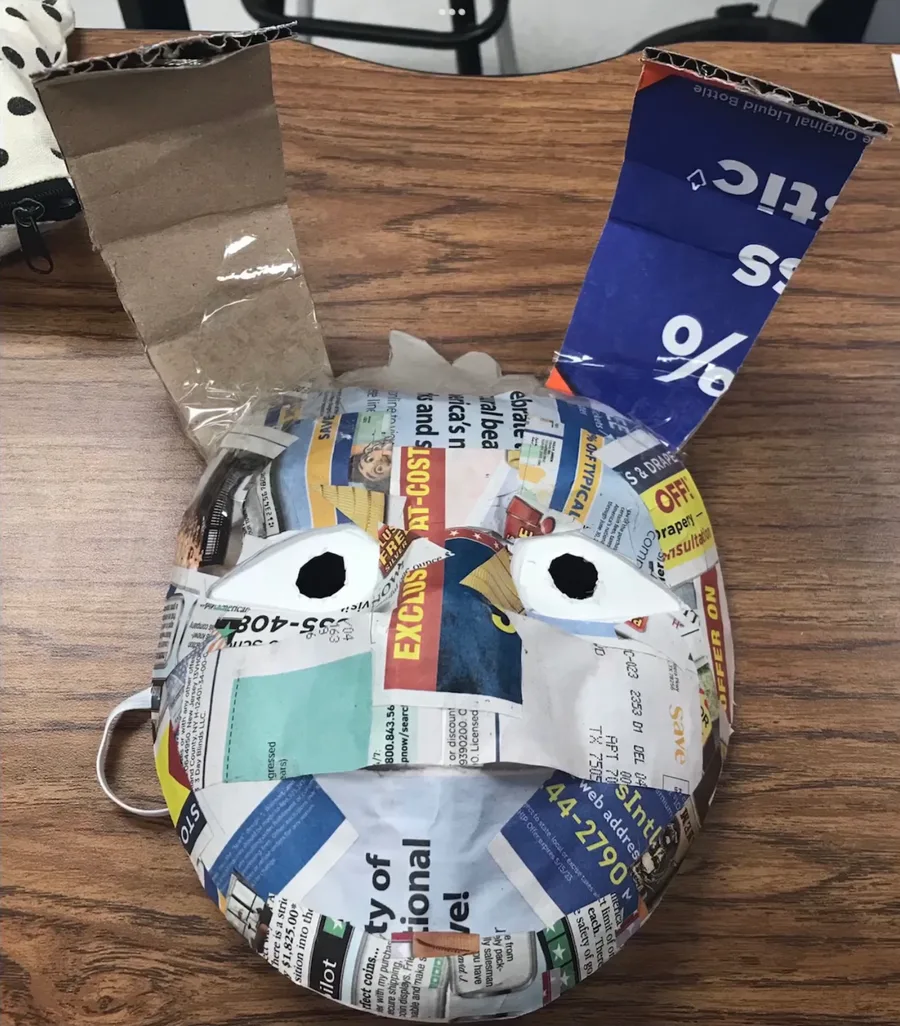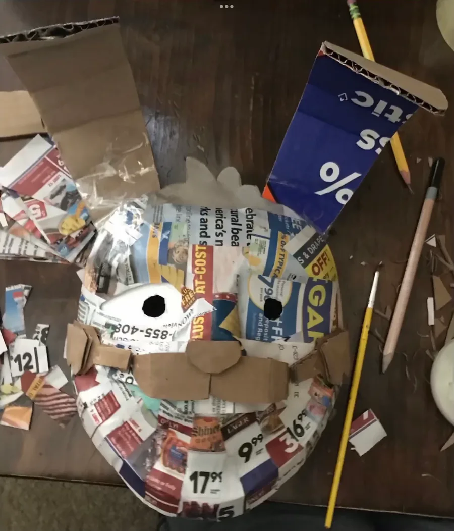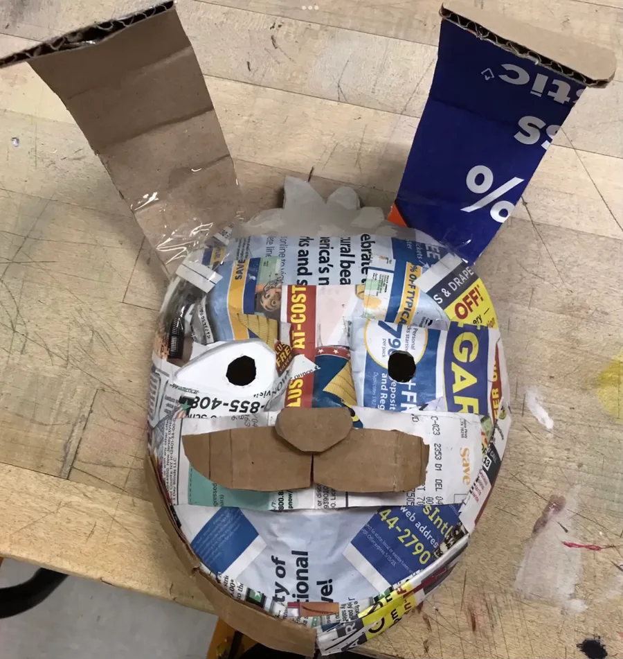 Mi máscara de Vanny para mi proyecto de arte echa de cartón pegamento y periódico