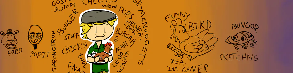 The username says everything. I love pop culture, Fnaf, and chicken/chickens. I have a youtube account if you wanna check that out. I'm not planning on taking it too seriously, I just want to make someone smile every now and then. I currently work alongside @Star_Coin