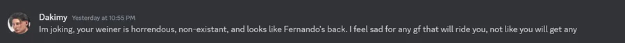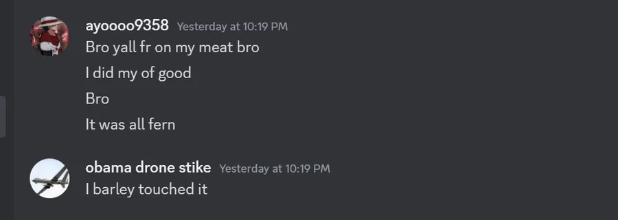 man my irl friends going crazy in the discord group chat.(they were arguing about something being messed up in the Minecraft server we have) (fernando is the obama drone strike guy btw)