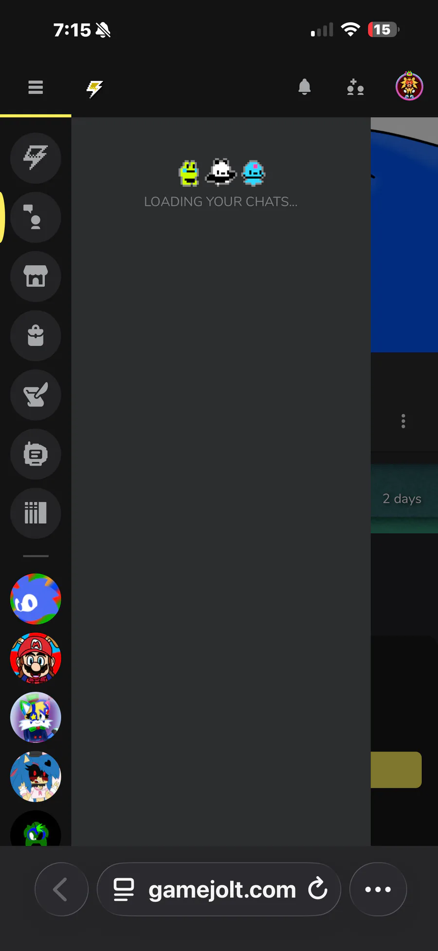 My game jolt is not working I can’t talk to my friends and this happened yesterday I can’t even see what in fnas community
