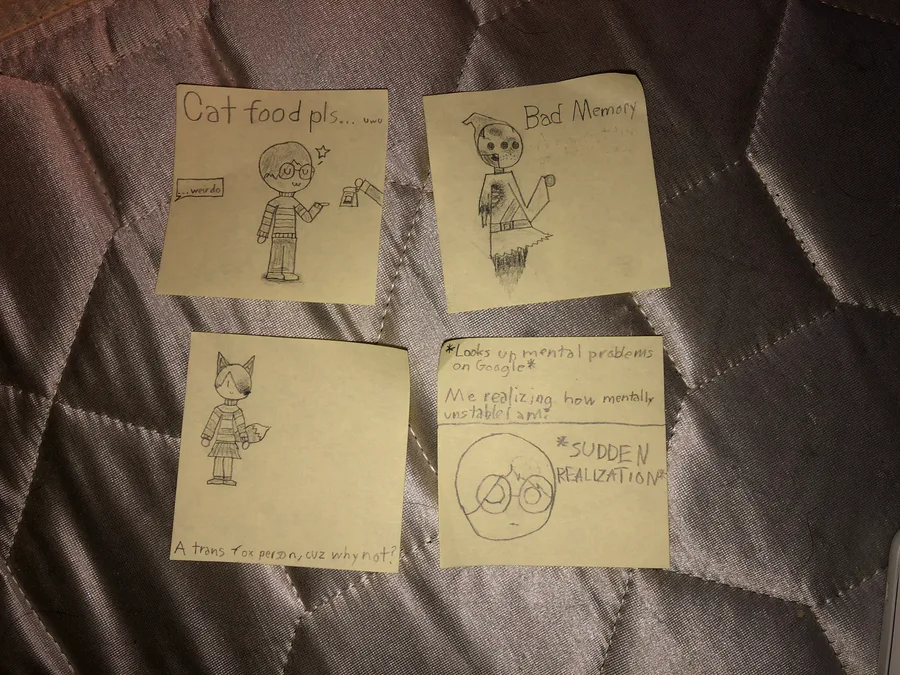 3 pieces of art and 1 meme that i made on a few sticky notes.