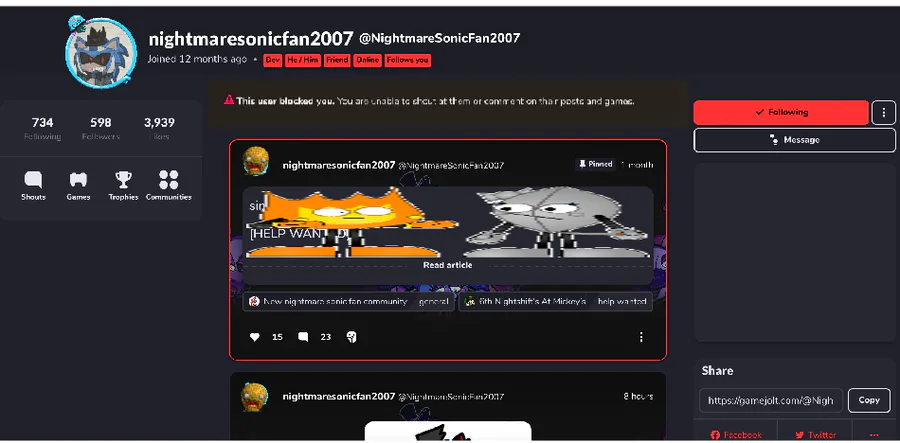 oh no @NightmareSonicFan2007 had blocked me so uh totally go block him WOW