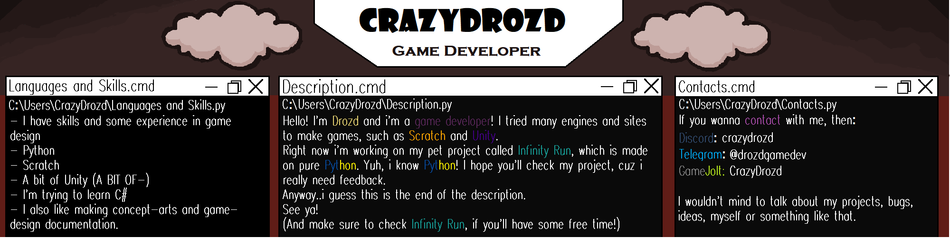 Hi! I'm Drozd and i'm a game developer! I'm 17 yo.