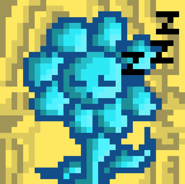 Это мой первый пиксельный рисунок. Это Blue flower, что переводится как голубой цветок. Он является питомцем короля тёмной стороны королевства(он является самим королевством, так как занимает половину альтернативного мира, где они живут).