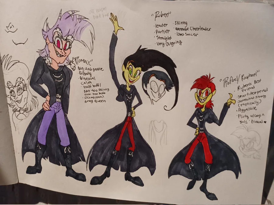 Hey everyone these are my rare hunter ocs rough sketches and drawings, just to give an idea of what they look like! :) 1st is Ruben the team leader, if he was a girl, cheerleader! Florence gentle giant and Rafael the smaller but aggressive! Crzy hir guys!
