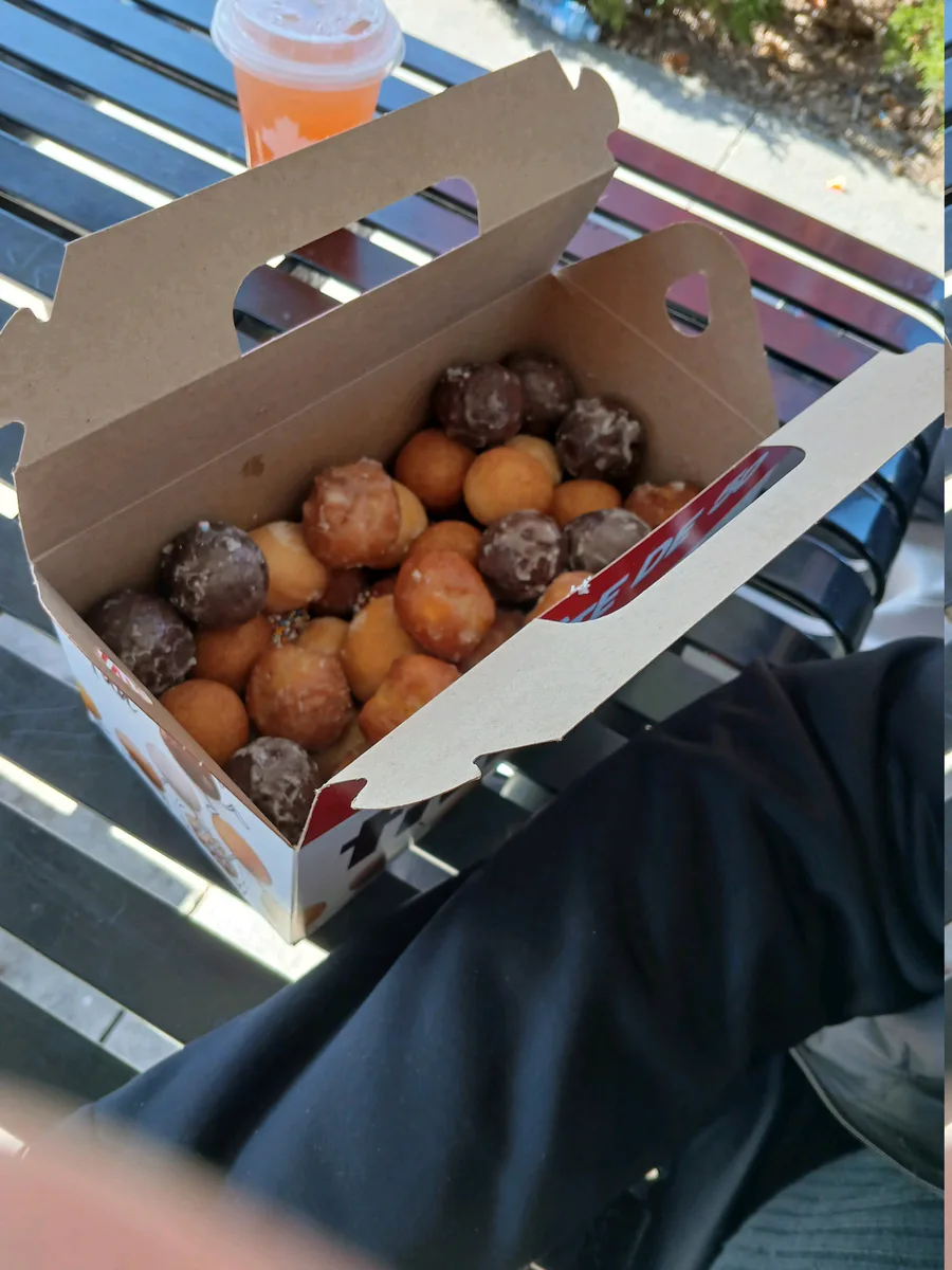 My dad accidentally got 50 timbits from Tim Hortons.