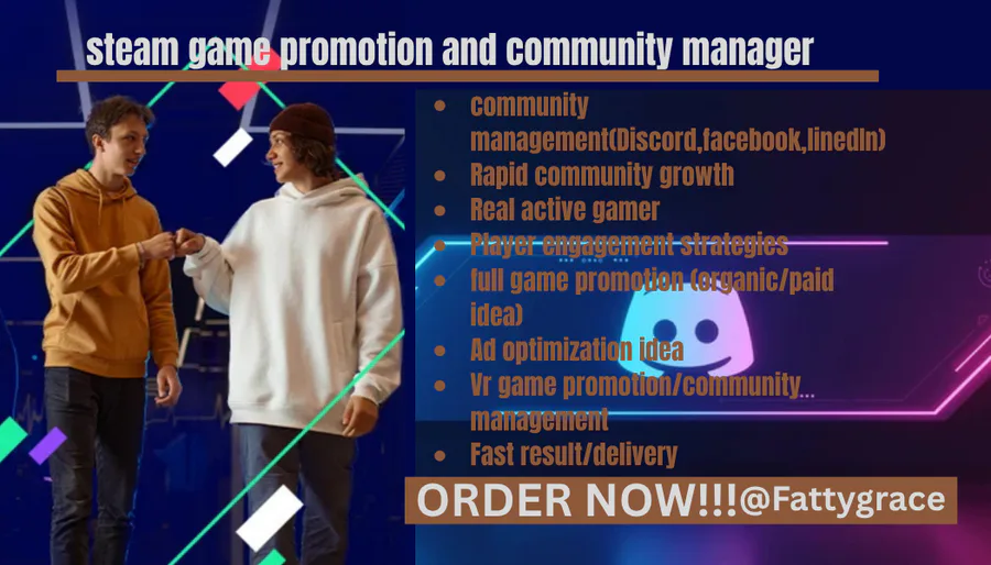 I'm Fattygrace game promoter and community manager , passionate ,Providing real, active promotion that increases reach, player engagement, and community growth for games and developers. i specialize in steam game ,epic game ,indie game ,fortnite game , action game, shooting game, Vr game to real active gamer to play , install and give positve review. If you are a developer looking to reach more players and build a strong community around your game, FEEL FREE TO CONNECT WITH ME AND LETS GROW YOUR GAME TOGETHER NOW!!!