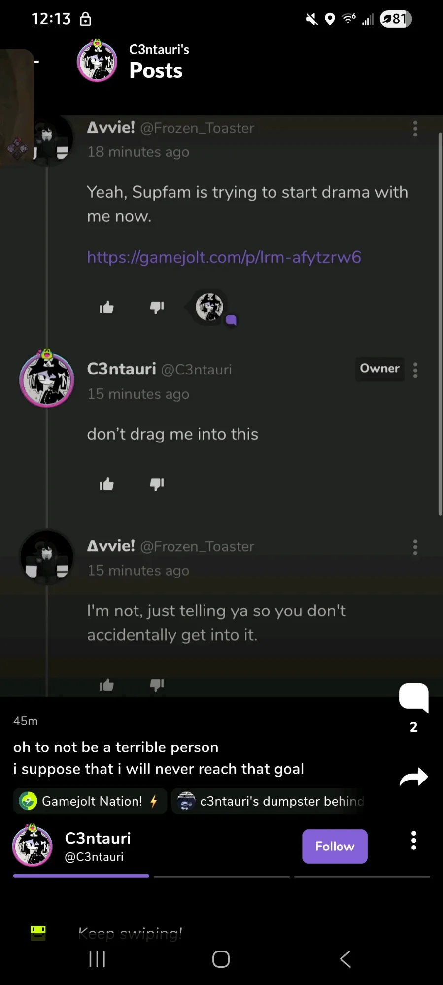How to avoid getting into drama: https://gamejolt.com/p/people-be-complaining-about-drama-and-shit-just-do-what-i-do-sta-srmgwxkm