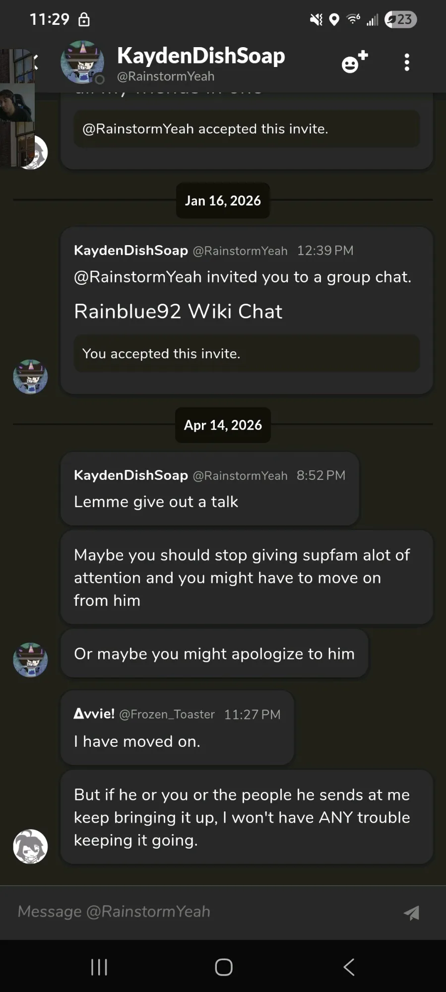 , if you or the people you send at me keep bringing it up. You cant tell me to forget it if you keep sending your goons at me to bring it up and scold me.