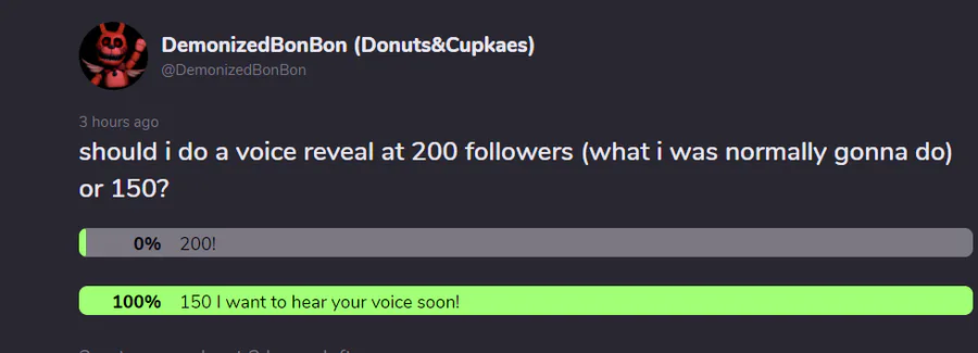 alright.. Guess im doing a voice reveal at 150 followers... yayyyy...