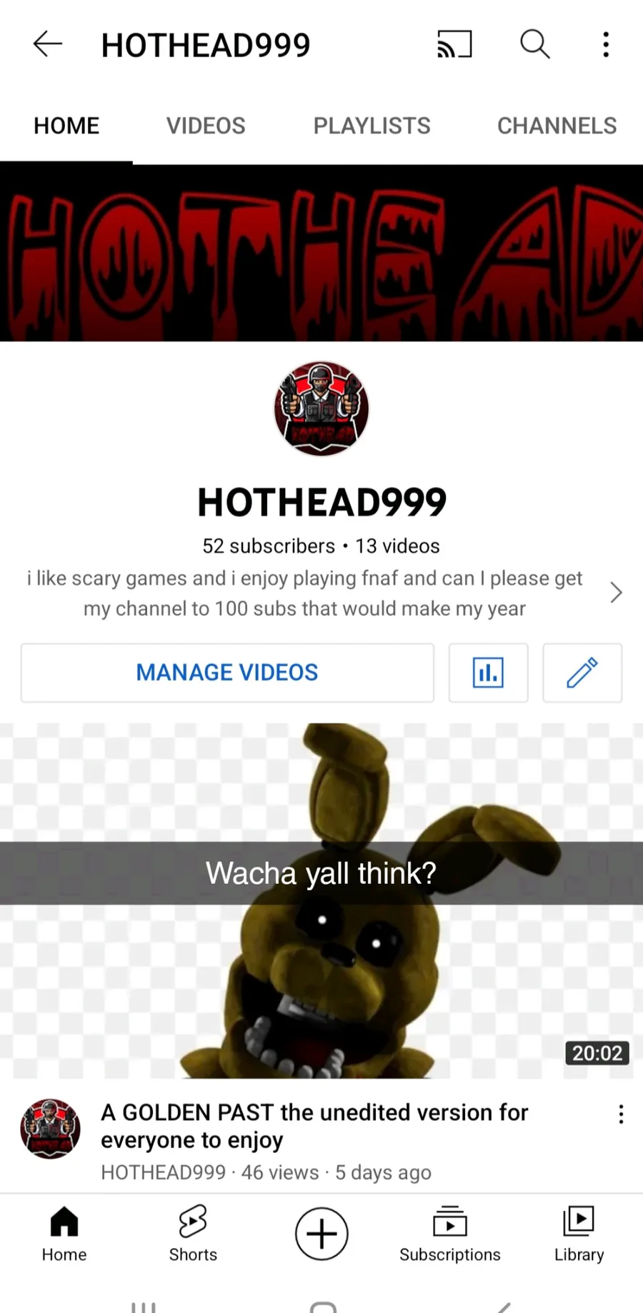 Hello everyone I'm a young YouTuber I'm 16 and only at 52 subs and I wish to grow my channel more and more I wish to get a 100 subs before the end of the year that would make my birthday wish come true and in all honesty I'm slowly giving up on YouTube bc I never thought it would be this difficult to grow subs but I will try my best to continue and press onwards