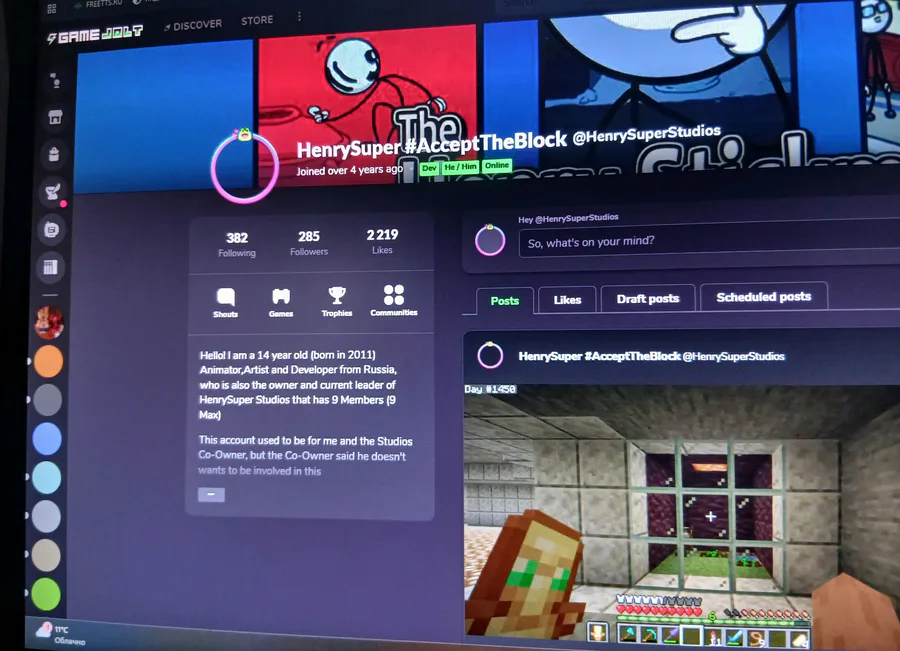 Hello! I am a 14 year old (born in 2011) Animator,Artist and Developer from Russia, who is also the owner and current leader of HenrySuper Studios that has 9 Members (9 Max)