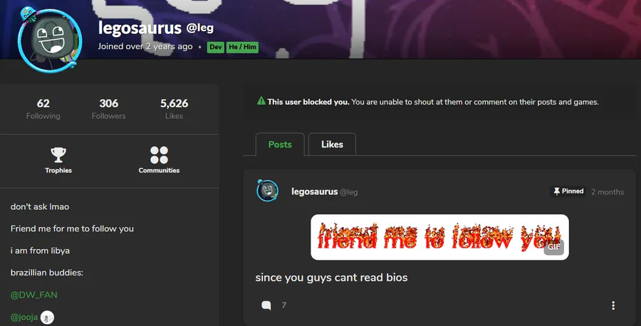 this guy blocked me for some reason. idk why. idk even know him. Edit: he unblocked me.