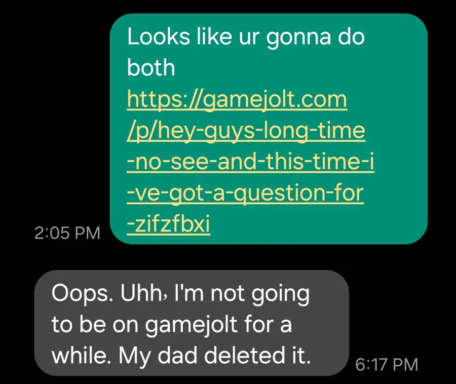Their dad deleted game jolt off her phone. So for the "face and voice reveal" she was ment to do, well... idk if u guys are gonna get it until she gets her account back