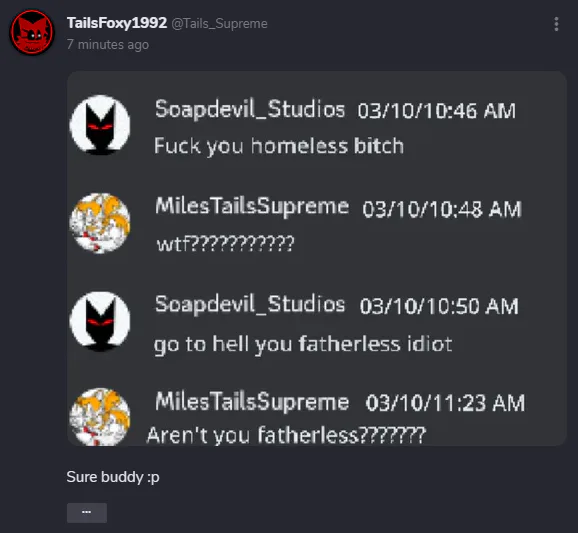 Tails_Supreme literally Lied about me calling him homeless i've had him blocked for over a month now. He's a liar. There was NO messages on March 10, 10:46 - 11:23 AM