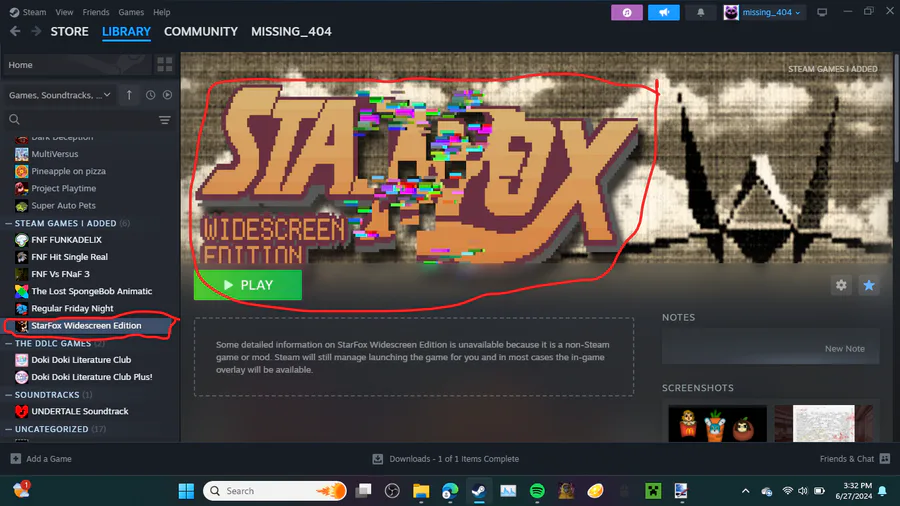 I added your StarFox game to steam, I don't know if I should have called it widescreen edition of exe, if you want me to get rid of it, I can, but only i have the game, and that is the only way it goes.