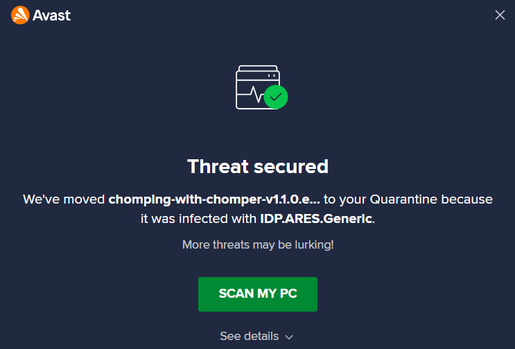 Recently released fan game Chomping with Chompers was flagged on my antivirus. Looking into if this is a false positive or not. I doubt this is intentional, but stay safe everybody!