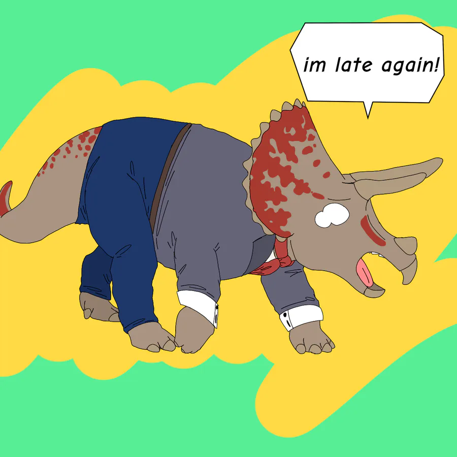 A triceratops that is late for work
