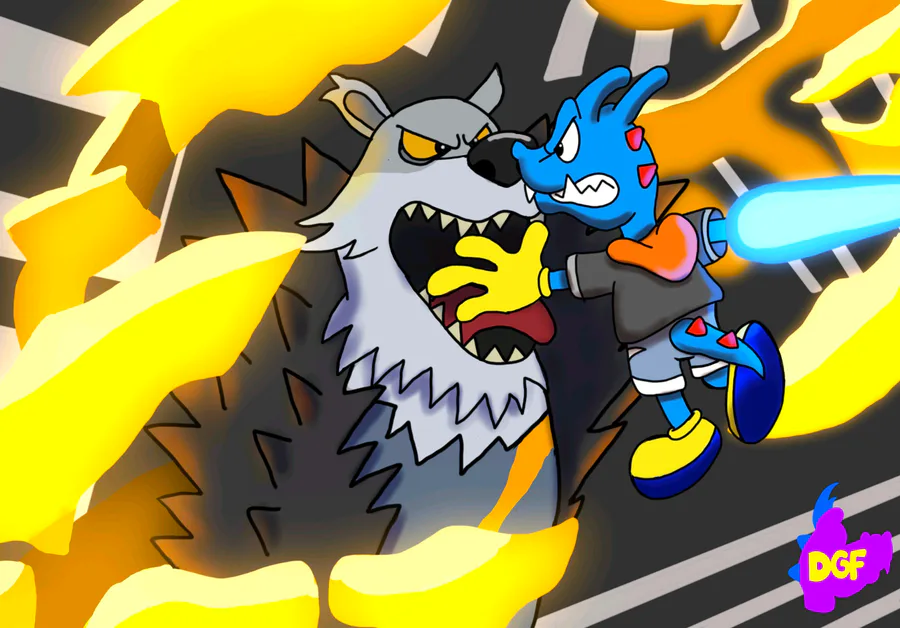 Next is Draco, dressed up like Rindo Kanade, fighting the Mosh Grizzly Noise from TWEWY (The World Ends With You). I made the Noise more Cartoony on purpose. I AM a cartoonist after all ;)