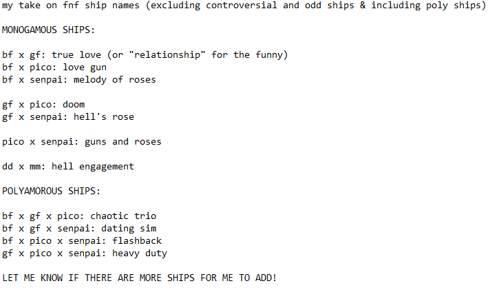 Anyways, i was bored, so i decided to make my own take on fnf ship names!