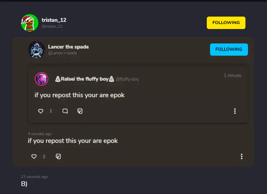 hey guys can u go follow @tristan_12 he is a really nice and kind dude, ik u all are very nice and caring so I wish u all could be his friend, but please remember this is a choice I love u all and thank u if u do <3