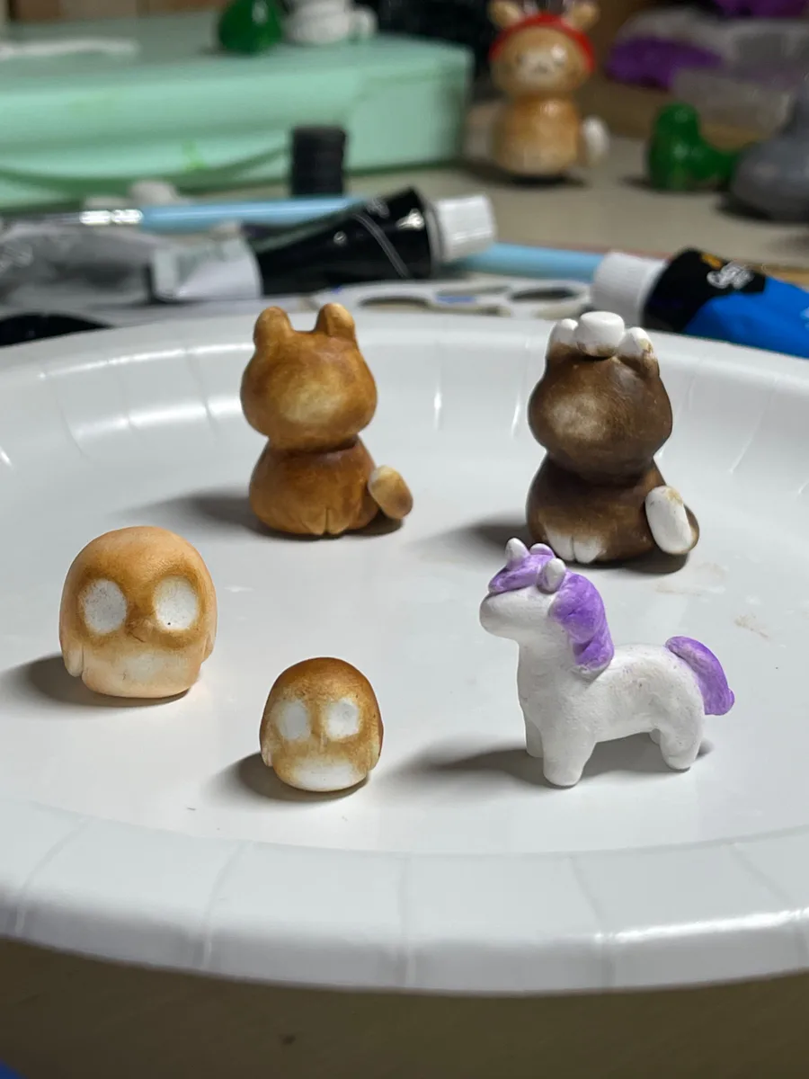 Wip of a couple clay owls, a unicorn, and a couple Christmas cats that I’ll post the finished pieces of soon!🥰🤩