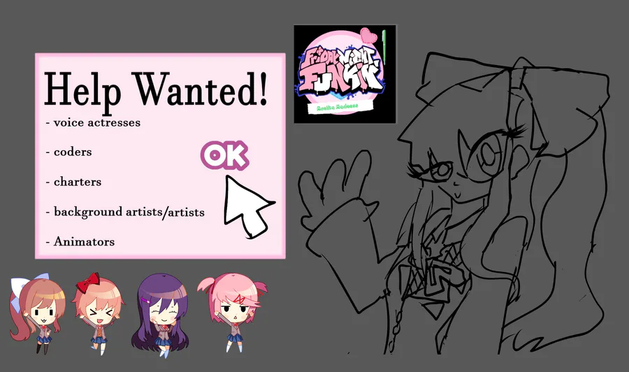 Hello, people of Gamejolt. I've been in the process of working on a mod called Monika Madness, a mod based off of ddlc as well as some fun crossovers! I would love if any of you would be willing to help with voice acting or anything in the pic. Please!