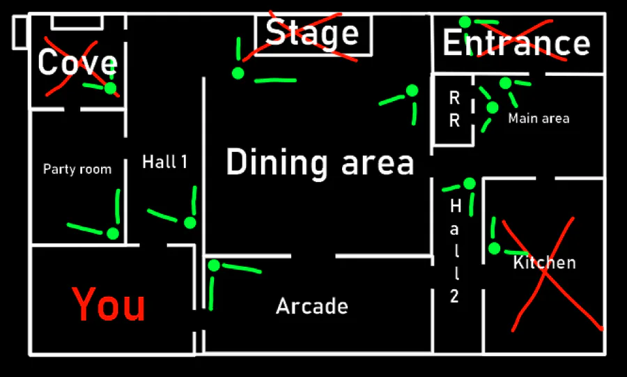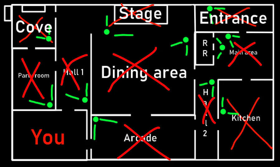 For the returning project, got some of the rooms made. I'll reveal what this is when the map gets finished, but I am gonna share this. What's crossed in red is done, the green parts is where the cameras will be facing. A long way to go lol