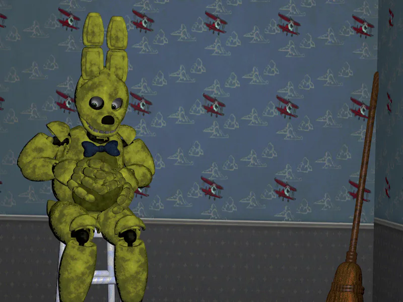 ''So whe found the lost endoskeleton in the woods from Edwin and he said it could fit into any mascot costume or whatever..... it's already jammed in the Fredbear costume...... Thanks Murray''