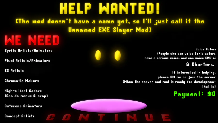 Hello! So I'm doing a mod for the EXE Slayer that will have an actual story/lore for it, there isn't much planned yet, but there will be during development, also this is a thread cause I can't really fit everything here so yeah.