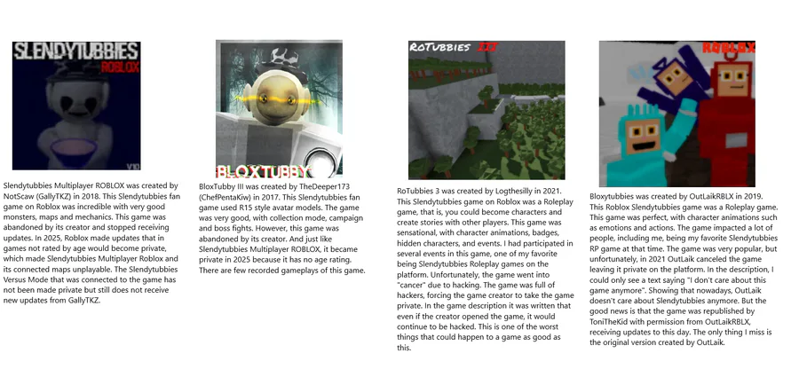 Lost Slendytubbies games on Roblox. Here I will present 4 Slendytubbies games on Roblox that I played and that I liked. They are: Slendytubbies Multiplayer ROBLOX, BloxTubby III, RoTubbies 3 and Bloxytubbies. Try reading the image by zooming.