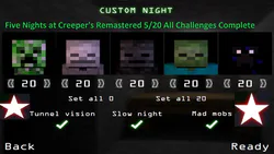 Hi I did a thing in a game and I think as far as I know I'm the first person in the world to beat it so uh that's cool. This is the max mode in five nights at creeper's remastered with all challenges active