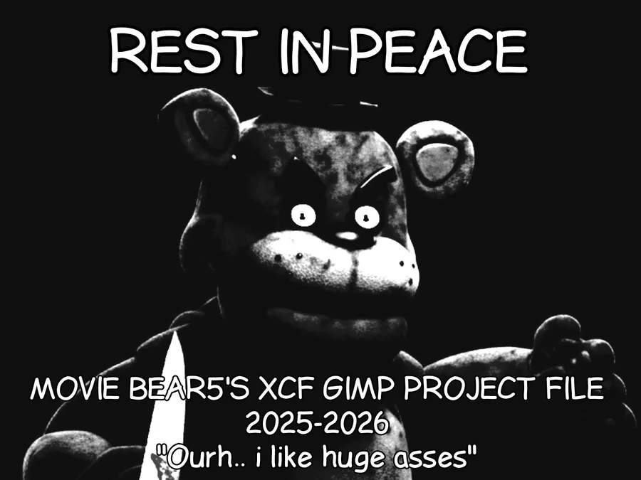 CALLING ALL CHEMICAL INTERACTIVE FANS. We just officially lost the original XCF of the Movie Bear5 image. The XCF file is now 0 bytes, which means we're unable to recover it. You guys will not see alt versions of this image ever again, sadly.