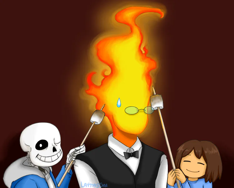Sans and Frisk employ their good friend Grillby to help them out with cookin' up some marshmallows. Don't worry Grillby is fine he's mostly just confused xD