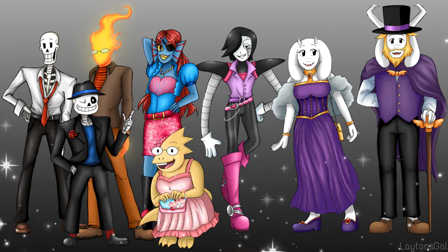Over the past few months, I'd been working on a series of pieces of various Undertale characters but in fancy clothes! This is the final version of them all together :)