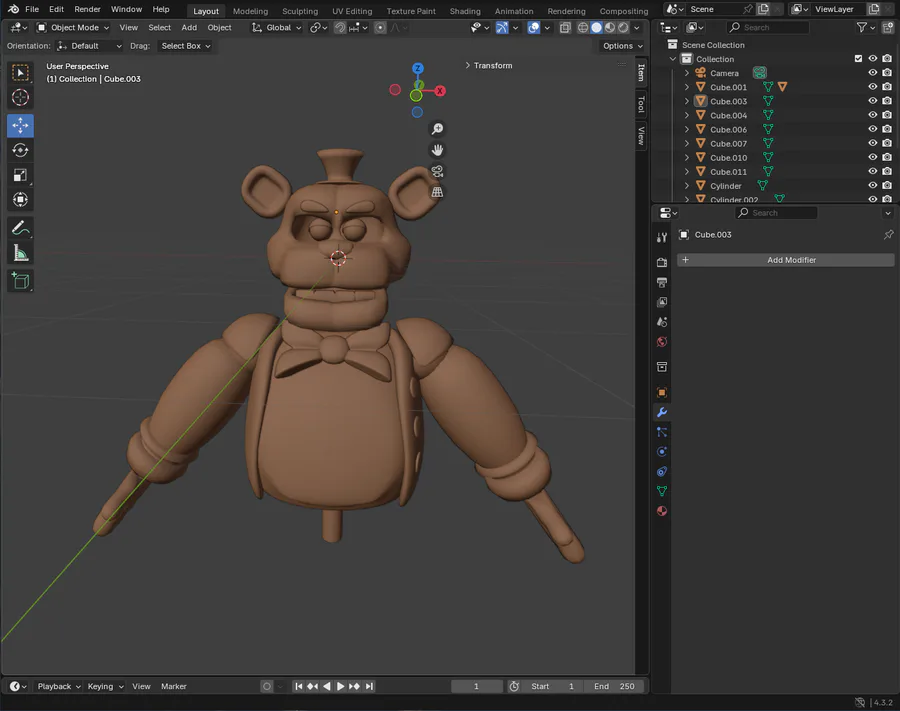 Hey, party people! I have this unfinished Freddy model that I want to finish. However, there are two problems that make it kinda hard. 1: Motivation, and 2: I am terrible with texturing. Any tips or ideas? (Sorry for the grainy image, it's a screenshot.)