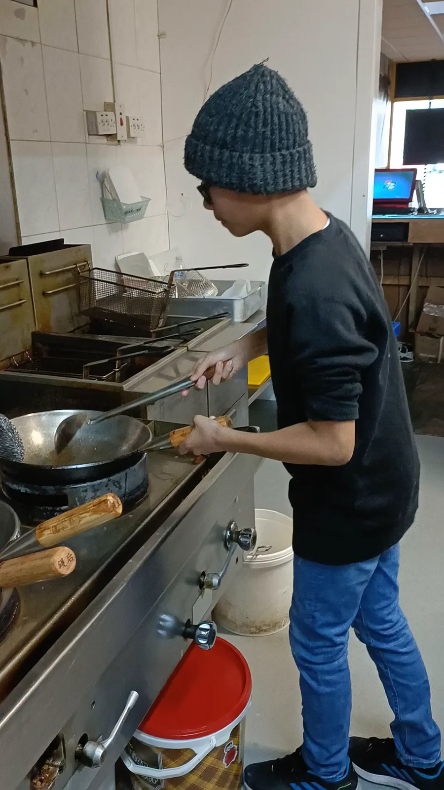 POV when my brother try to fliped a sponge for learning in the kitchen.