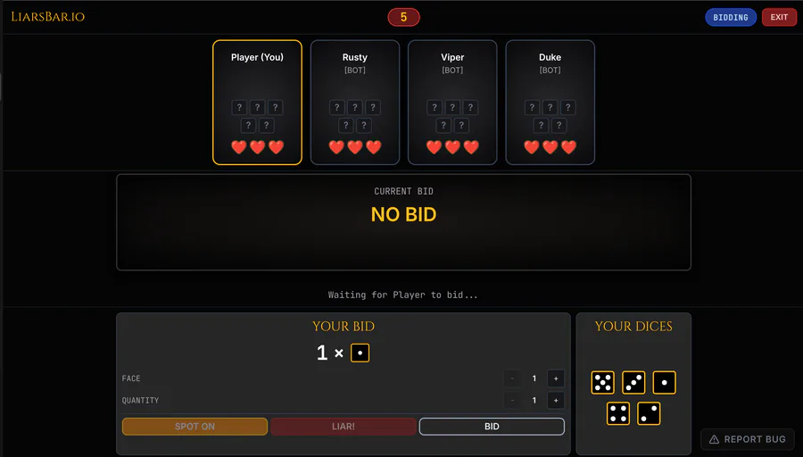I just released LiarsBar.io - a web-based version of the classic bluffing game "Liar's Dice". It is fully multiplayer and runs directly in your browser.