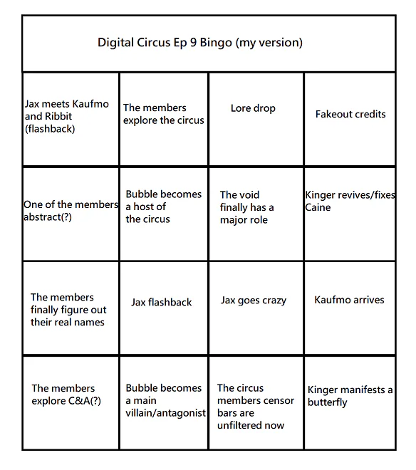 Here's a bingo card for ep 9, it might not be accurate but at least I tried :p