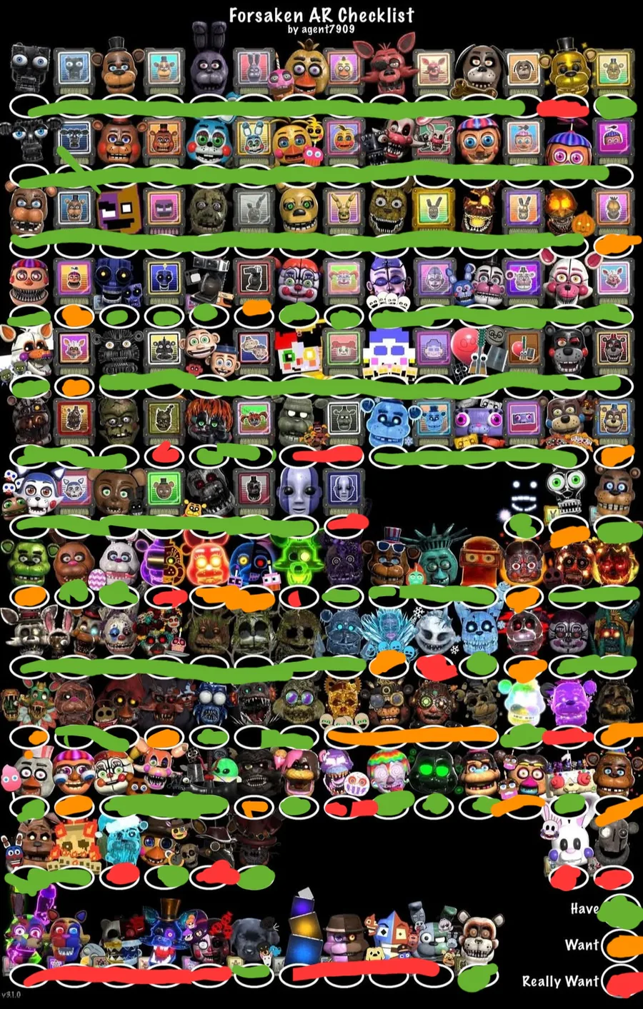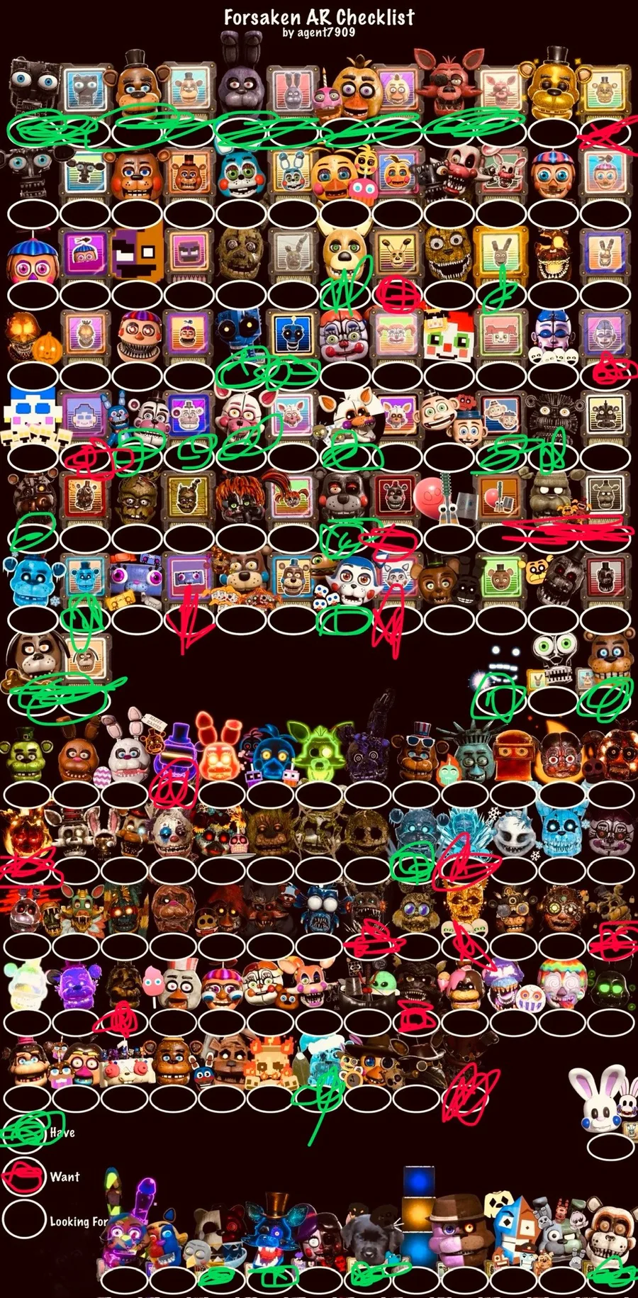 Hey guys, I once again updated my checklist for Forsaken AR if you want to trade. The suit I want most at the moment is Golden Freddy so if any of you have him we can discuss a fair trade. Thanks